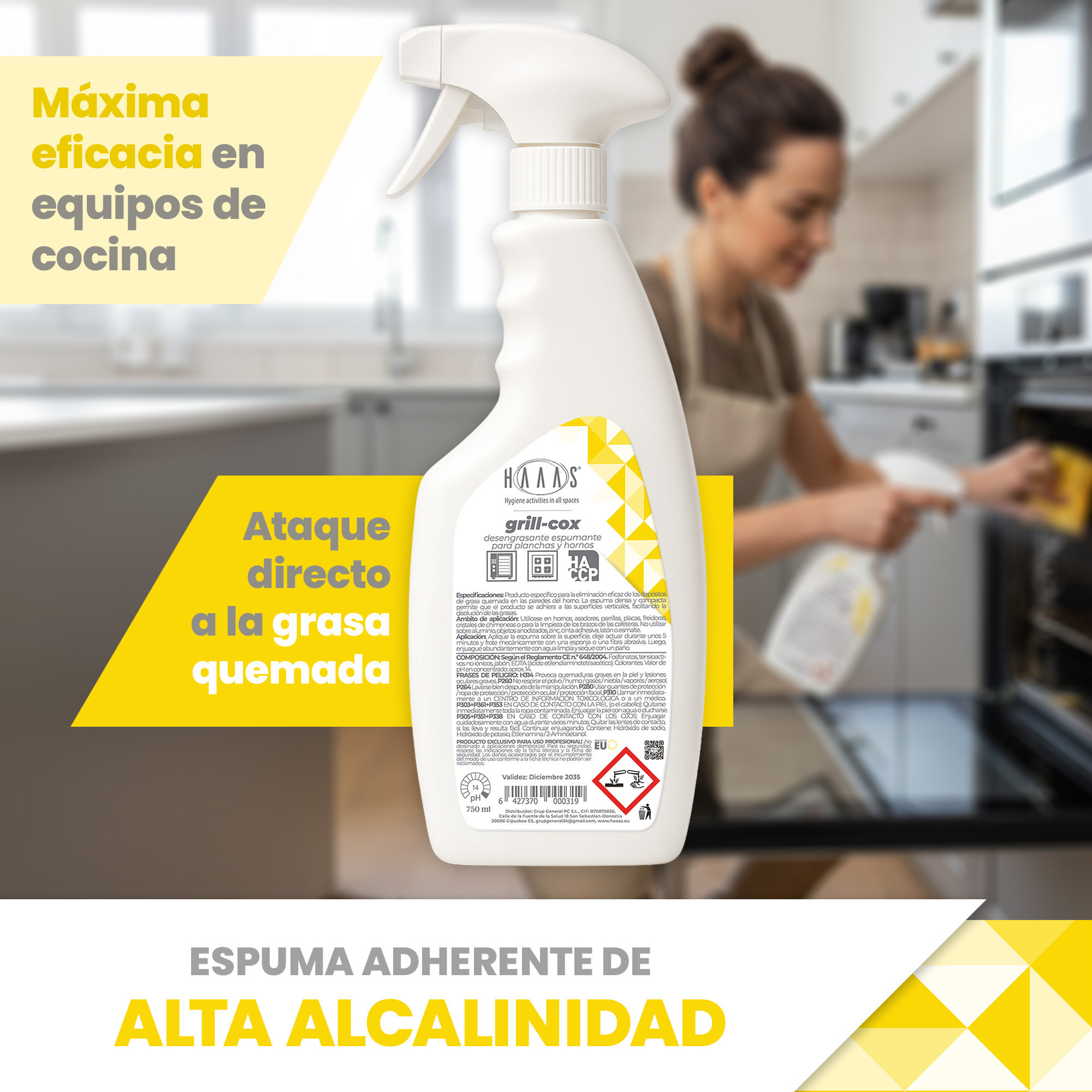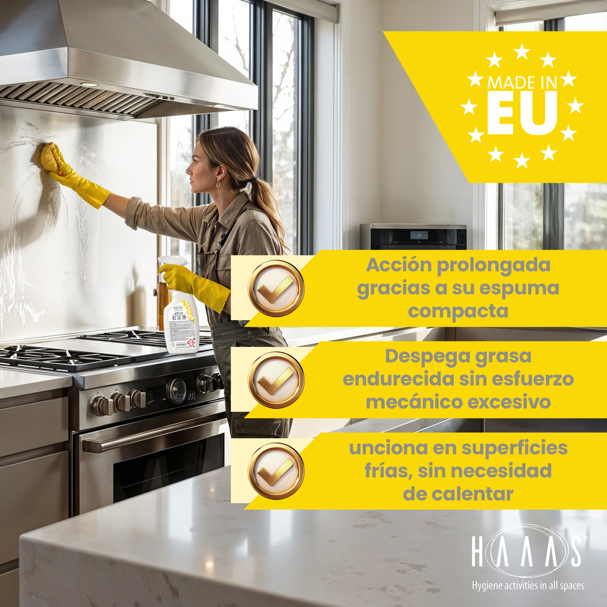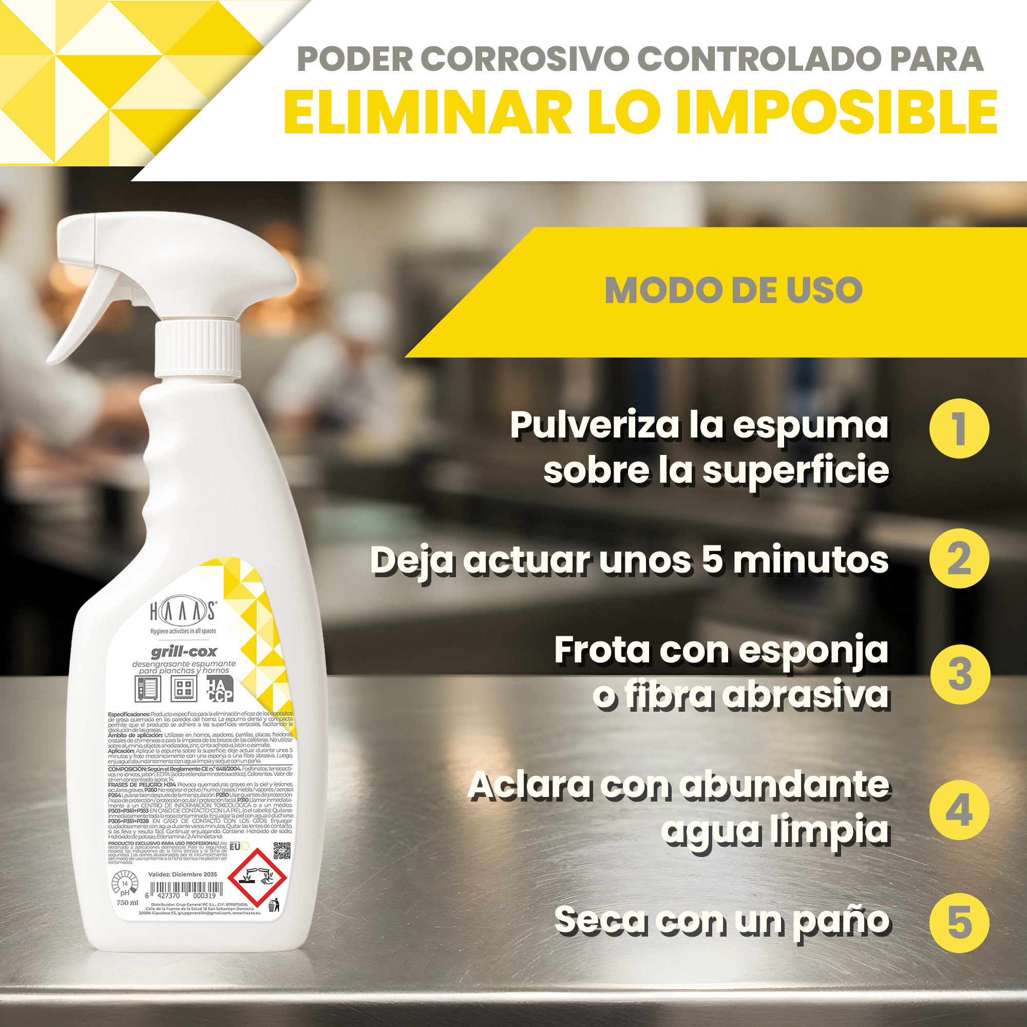 Aplicar la espuma sobre la superficie, dejar actuar unos 5 minutos y frotar mecánicamente con esponja o fibra abrasiva, luego enjuagar abundantemente con agua limpia y secar con un paño.