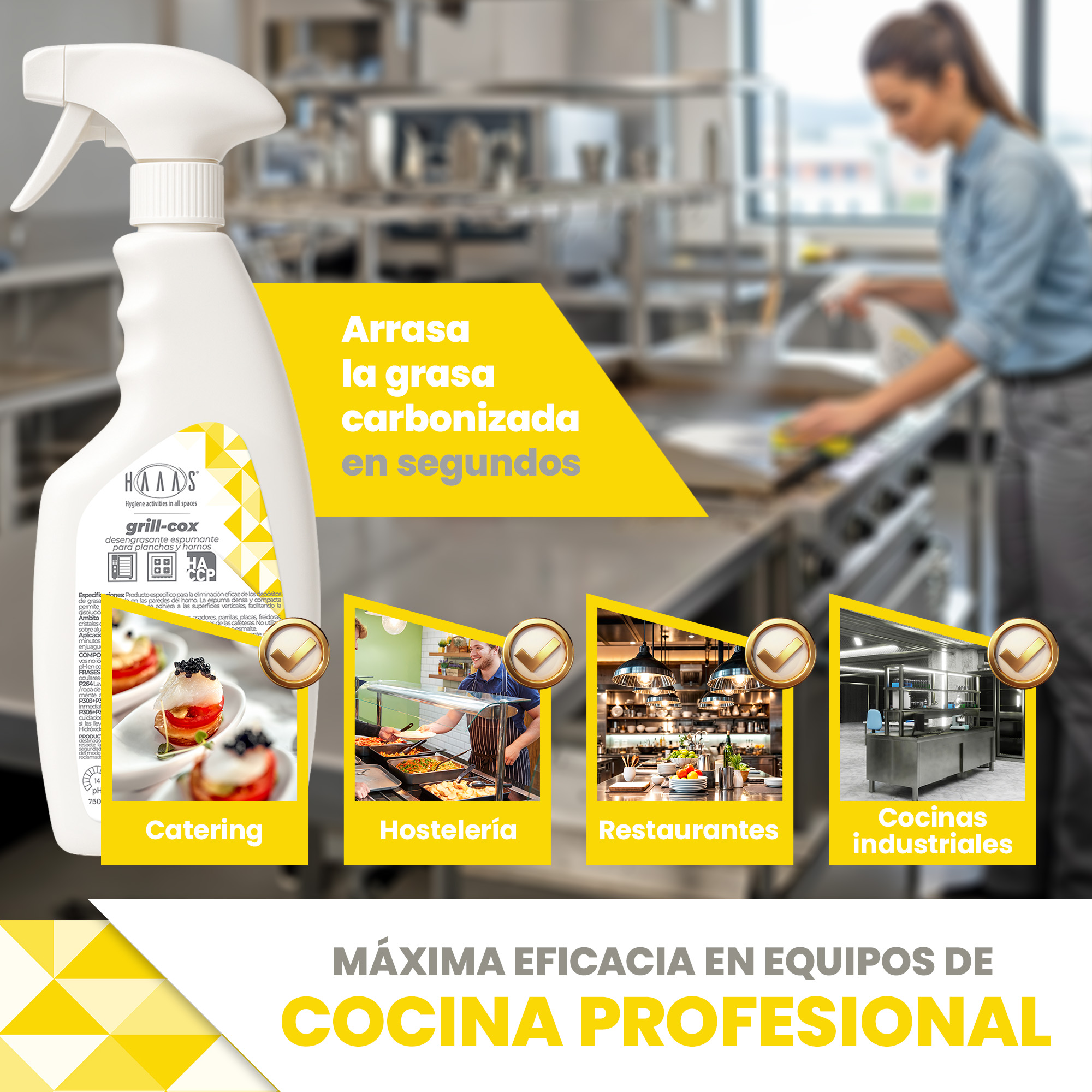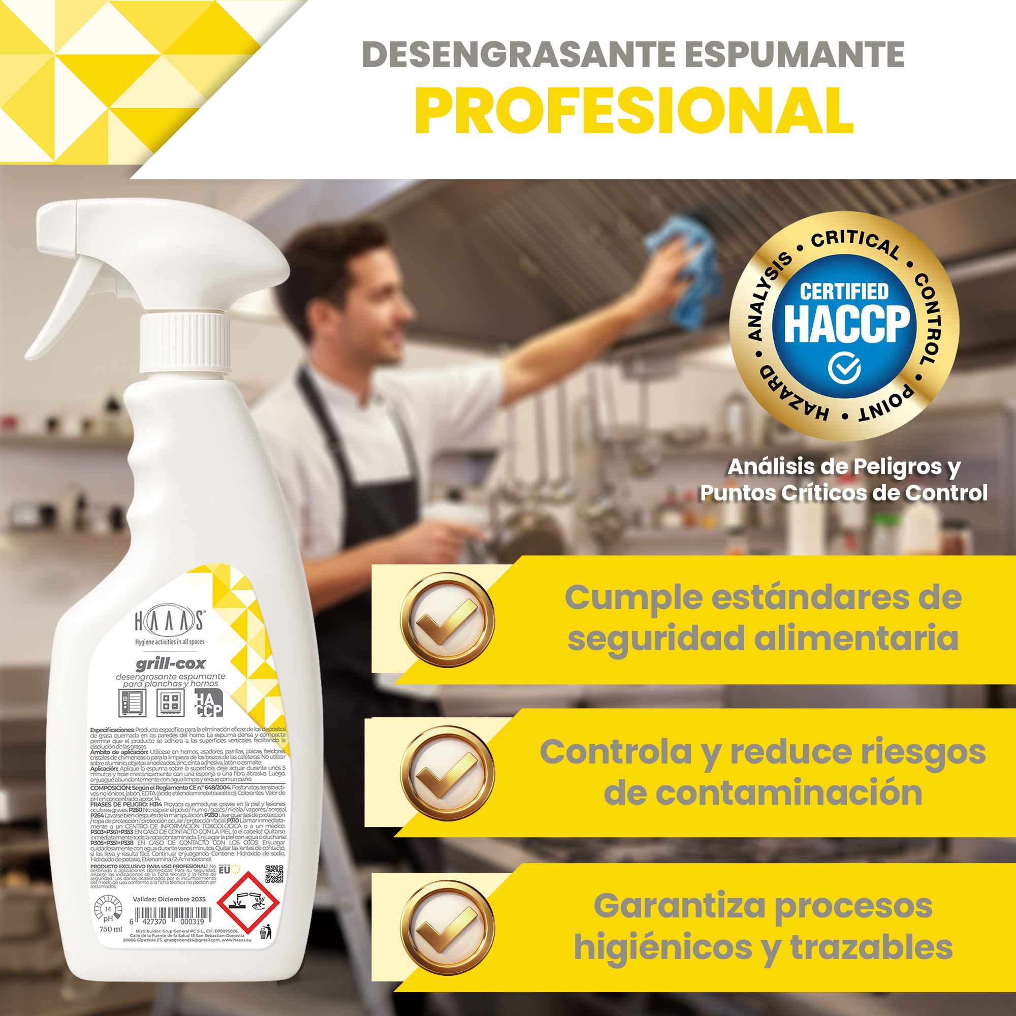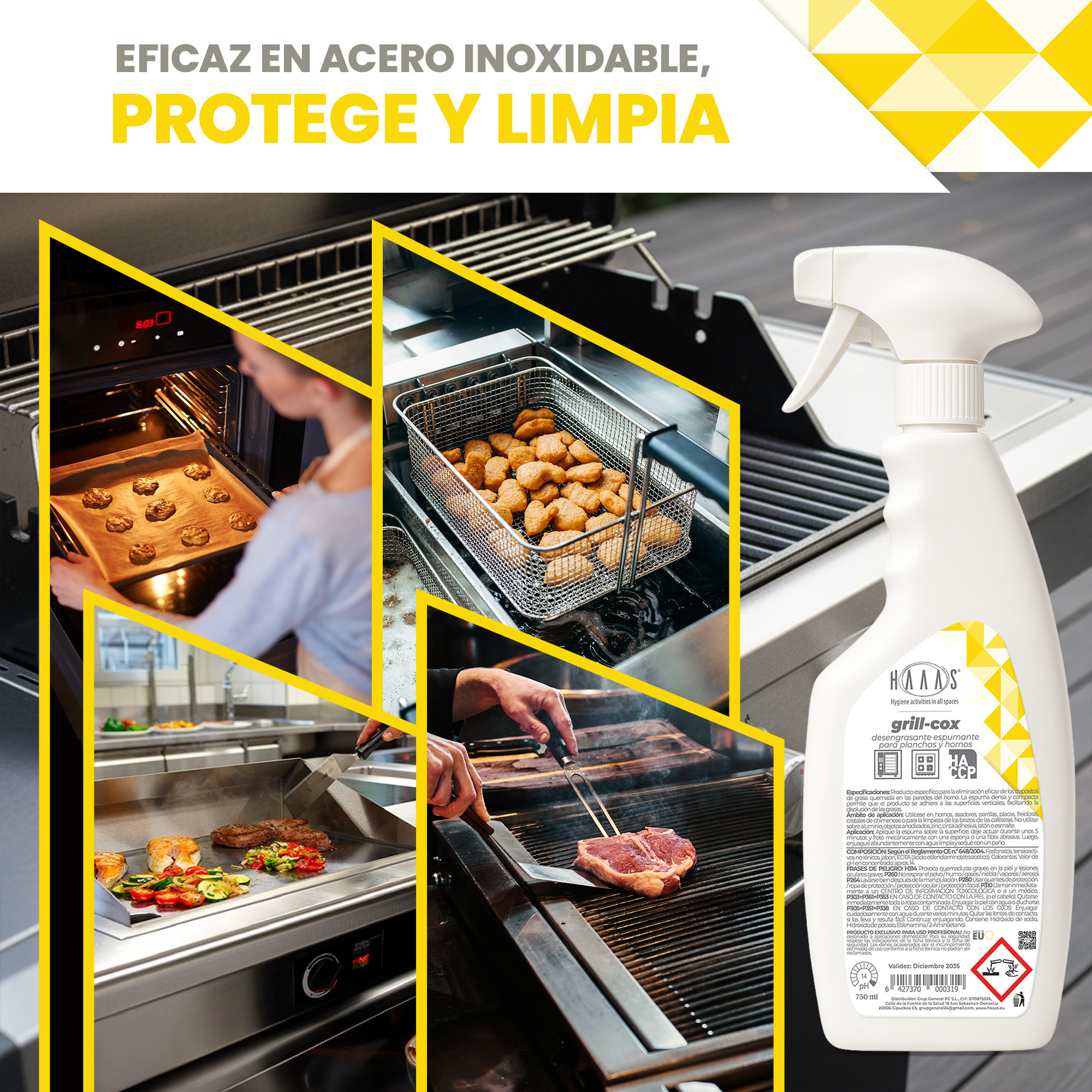 Aplicar la espuma sobre la superficie, dejar actuar unos 5 minutos y frotar mecánicamente con esponja o fibra abrasiva, luego enjuagar abundantemente con agua limpia y secar con un paño.