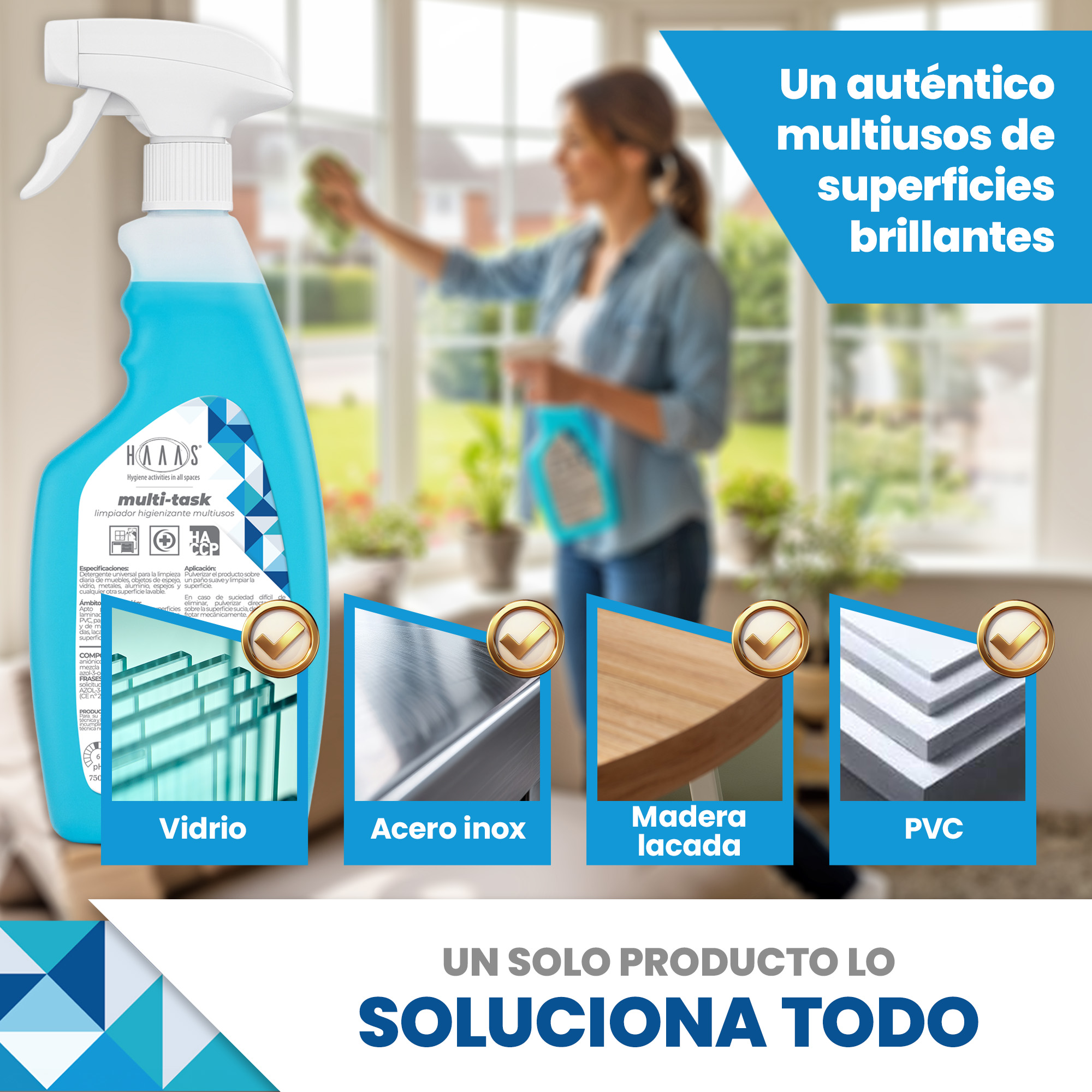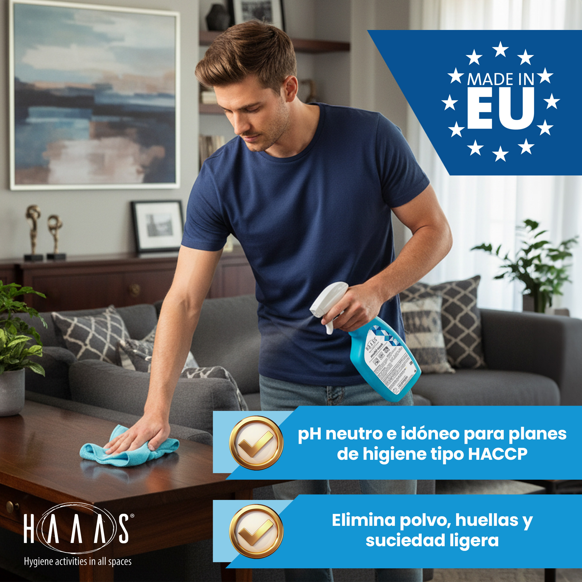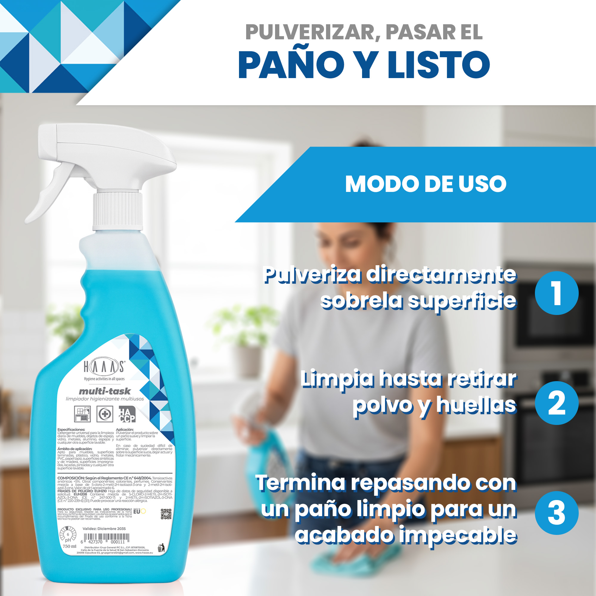 Rocíe el producto sobre un paño suave y limpie la superficie.