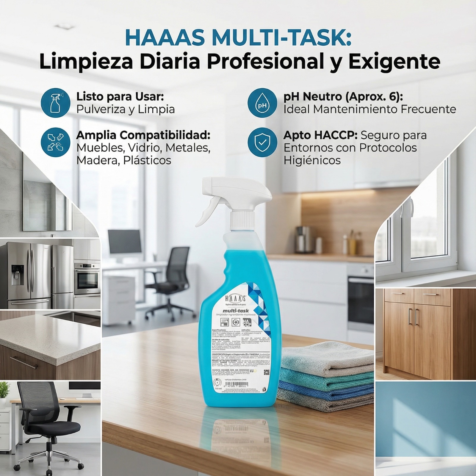 Apto para muebles, espejos, superficies laminadas, plástico, vidrio, metales, PVC, papel pintado con superficies sintéticas y de madera, superficies impregnadas, barnizadas, pintadas y cualquier otra superficie lavable.